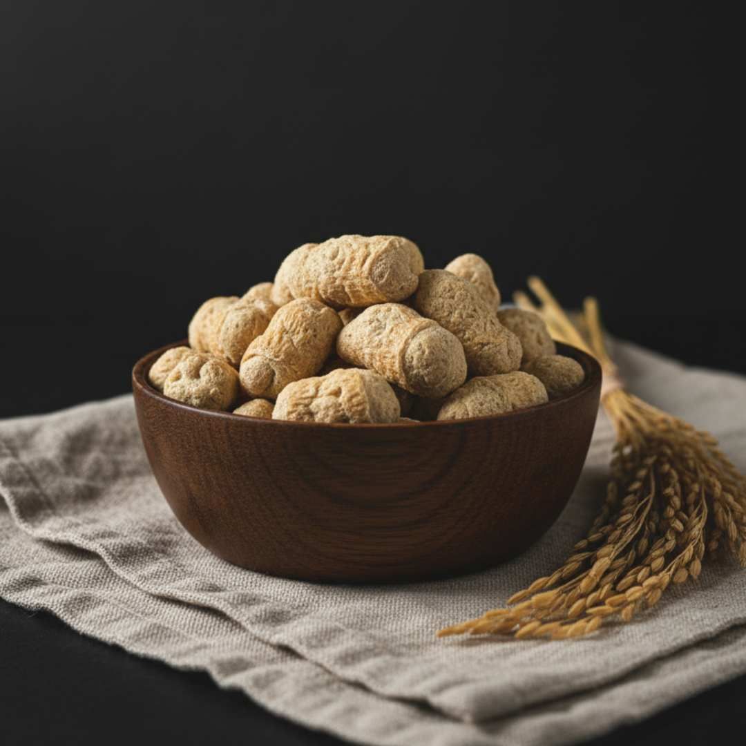 テクスチャード小麦タンパク質(TWP)は、小麦グルテンを押出成形して作られ、白身肉や海鮮の噛みごたえを忠実に再現する滑らかで弾力のあるテクスチャーを形成します。タンパク質含有量は約55〜65%に達し、その細かく伸縮性のある繊維は、魚のフィレ、カニかまぼこ、アサリの肉、繊細な白いタンパク質のカットに似たテクスチャーを作り出すのに役立ちます。